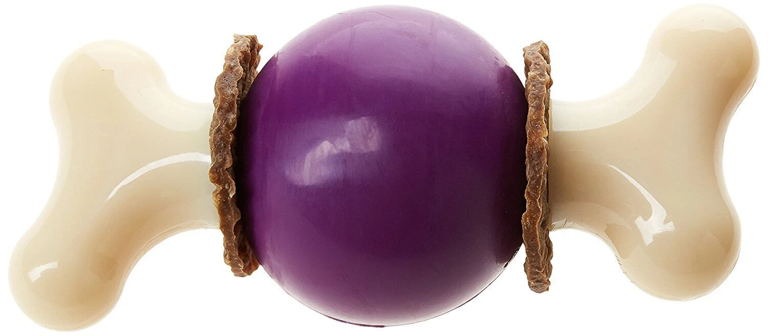 Le design rĂ©sistant de l’os en nylon et de la balle en caoutchouc permettent aux chiens de se faire les dents pendant longtemps.