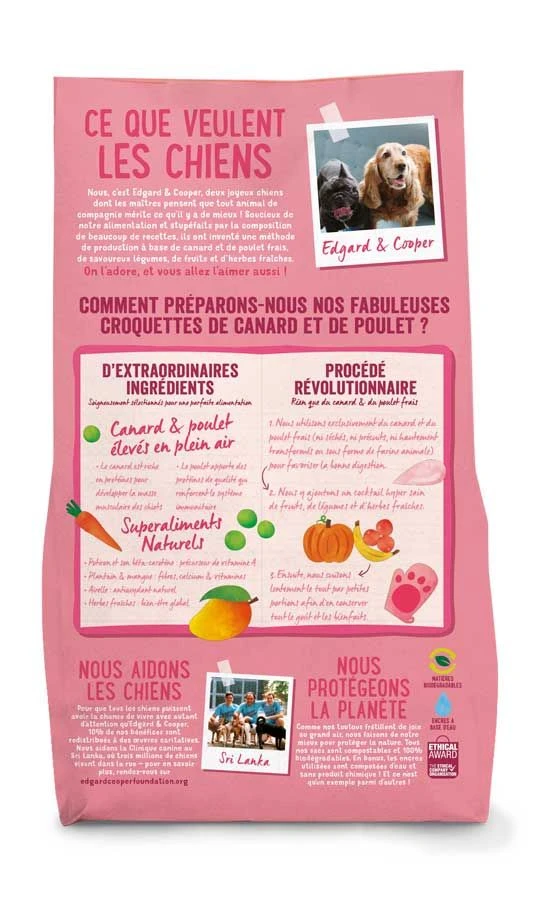 Cette recette simple réunit les nutriments et les saveurs du canard et du poulet avec un mélange délicieux de fruits, de légumes et de fines herbes. Cela veut dire zéro farine animale et pas d’ingrédients transformés ou séchés. Edgard & Cooper cuit lentement les croquettes pour préserver leurs saveurs naturelles, et y ajoute des prébiotiques, de l’huile de poisson et de lin pour augmenter leurs qualités nutritionnelles et faciliter la digestion. Cette recette contient également de la glucosamine et de la chondroïtine, bénéfiques pour la santé des articulations.