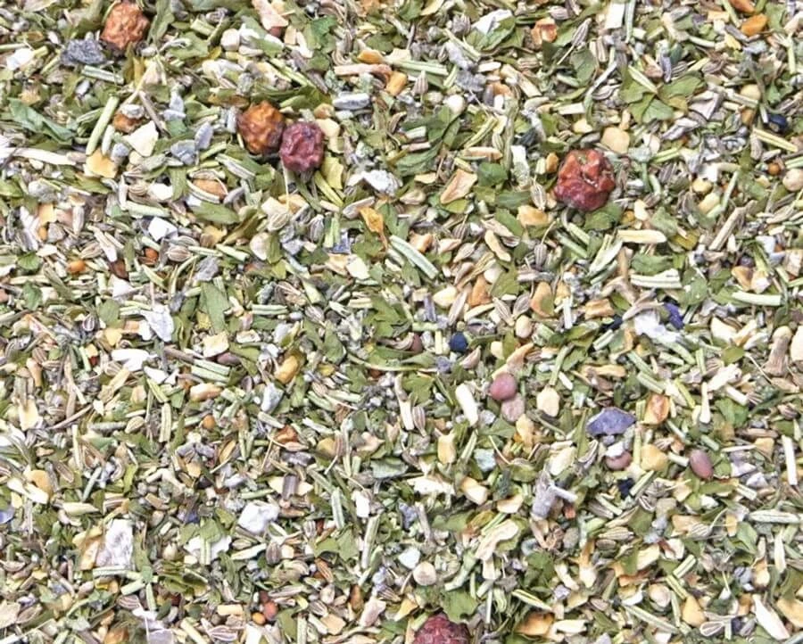 Mix séché (oignon, thym, anis, herbes) à mélanger régulièrement à la nourriture, une cuillère par kg.
