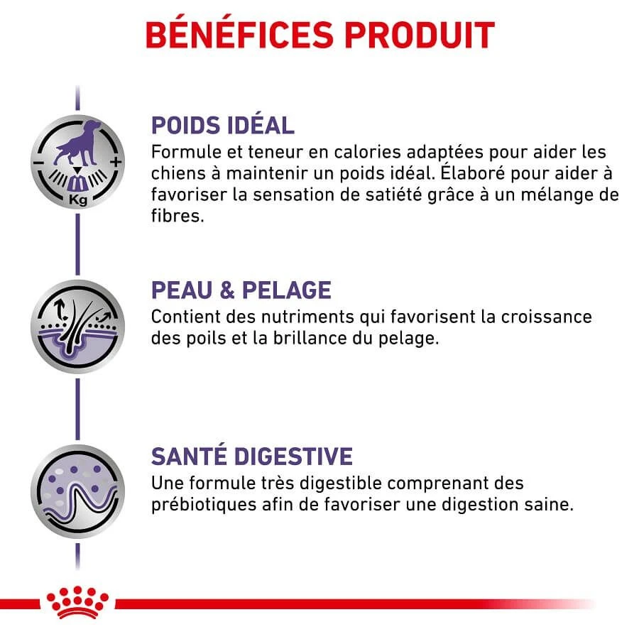Cette nutrition dispose d’une teneur modĂ©rĂ©e en matières grasses ainsi qu’un apport calorique contrĂ´lĂ© pour aider votre animal Ă maintenir un poids idĂ©al. De plus, elle offre une sensation de satiĂ©tĂ© Ă votre toutou grâce Ă son mĂ©lange de fibres.Â