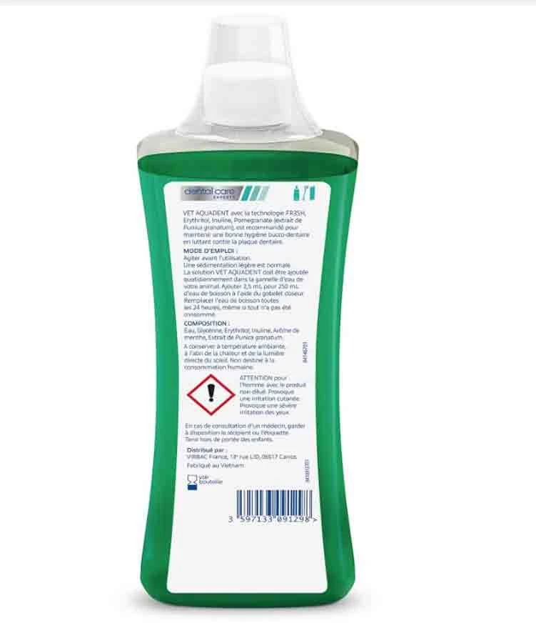 Vet Aquadent se dilue dans la gamelle d’eau quotidienne de l’animal. Sa formulation permet de prévenir l’apparition de la plaque dentaire et de préserver une haleine saine pour le bien-être de l’animal et de ses maîtres.